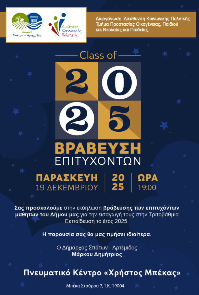 Σας προσκαλούμε στην εκδήλωση βράβευσης των επιτυχόντων στα Ανώτατα Εκπαιδευτικά Ιδρύματα την Παρασκευή 19 Δεκεμβρίου 2025 και ώρα 7:00 μ.μ. στο Πνευματικό Κέντρο “Χρήστος Μπέκας” (Σταύρου Μπέκα 7, Σπάτα).